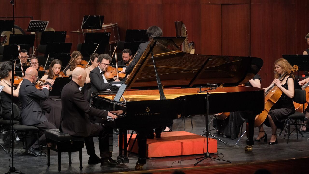 Ardından sahneye çıkan Muhiddin Dürrüoğlu, G. Gershwin’in klasik müzik ile cazı ustalıkla harmanlayan ve 20. yüzyılın en önemli eserlerinden biri olarak kabul edilen “Rhapsody in Blue” adlı yapıtını seslendirdi. Sanatçının teknik hakimiyeti ve yorum gücü, eserin karakteristik ruhunu dinleyicilere güçlü bir şekilde yansıttı ve büyük beğeni kazandı. Gecenin sonunda orkestra şefi Rustam Rahmedov, piyanistler Muhiddin Dürrüoğlu ve Özgür Aydın ile birlikte yeniden sahneye gelerek S. Rahmaninov’un altı el için yazdığı eseri seslendirdi. Bu keyifli bis performansı, konserin unutulmaz anları arasında yerini aldı. Tepebaşı Belediye Başkanı Dt. Ahmet Ataç da geceye katılanlar arasında yer aldı. Plaket takdiminin ardından unutulmaz konser sona erdi.